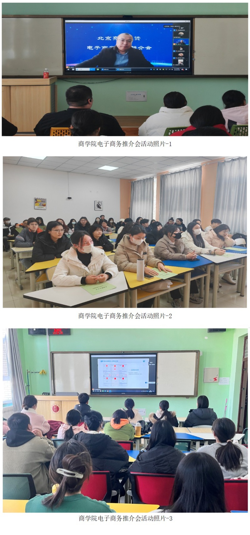 人才培养和就业工作表示衷心感谢。随后,杨永明先生就电子商务行业的发展历程、现状、未来趋势进行讲解,向学生普及电子商务行业的发展现状和未来趋势,提高同学们对行业的认知度。紧接着他介绍了北京亮马投资集团在电子商务领域的业务布局和投资方向,为有志于从事电子商务行业的同学提供就业和创业指导。最后,杨永明先生对北京亮马投资集团在电子商务领域的投资项目、成功案例进行展示和分享,讲述了企业与影视,直播,电商产业链之间的关系。互动提问环节中,同学们就自己所关心的专业对口、发展平台、入职培训等问题与杨先生进行互动交流,面对学生提出的问题,杨永明先生作了耐心细致地解答,学生在拓宽行业认知的同时,也加深了对工作岗位的了解。