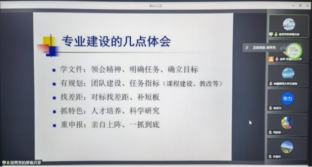 的“双万计划”建设情况,指出在一流专业建设中要重视做好“学文件、有规划、找差距、抓特色、重申报”五个方面的工作,并详细传授了国家级一流专业建设申报表的填写经验和技巧。最后,段教授还对青年教师们关心的问题逐一进行了解答。