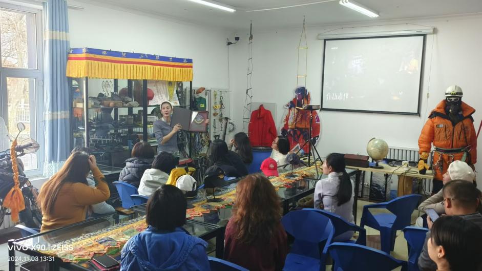 活动中,全体教师走进水西沟南溪路194号的登山历史馆参观,了解人类征服14座8000米级山峰的攀登历史。新疆首登珠峰女性马丽娅姆女士为大家细致讲述了自己四次攀登珠穆朗玛峰,两次成功登顶,以及在登山过程中很多惊心动魄的故事,致敬攀登精神。