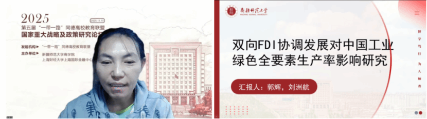 郭辉教授围绕“双向FDI协调发展对中国绿色全要素生产率影响研究主题发表主旨演讲。郭辉教授立足全球绿色转型趋势与中国工业发展实际,指出双向FDI作为统筹国内外市场资源的核心渠道,其协调发展对工业绿色转型具有重要意义。郭辉教授梳理了相关领域研究现状,明确现有研究的拓展空间,构建了双向FDI协调发展影响工业绿色全要素生产率的理论框架,采用测算方法与实证模型,分析了双向FDI协调发展和工业绿色全要素生产率的发展特征与区域差异,并验证了产业结构升级、绿色技术创新、数字基建的中介作用,并从制度开放、产业协同、创新生态、区域差异化发展、环境规制等方面提出政策建议,为工业绿色高质量发展提供理论参考与实践指引。