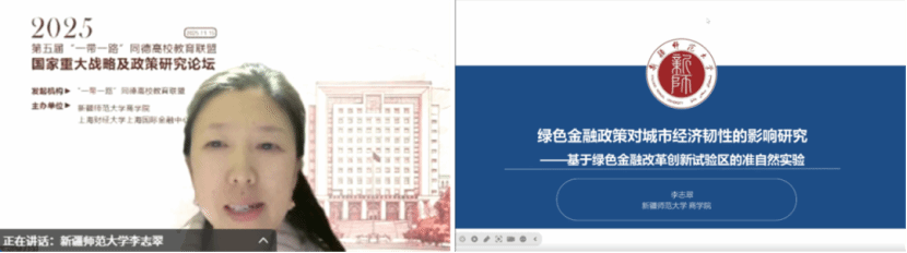 李志翠教授围绕“绿色金融政策对城市经济韧性的影响研究”主题发表主旨演讲。李志翠教授立足全球产业链重构与气候风险叠加的背景,结合国家相关战略部署与政策要求,指出绿色金融政策作为制度创新,对引导经济结构绿色转型、增强城市经济风险抵御能力具有重要意义。李志翠教授梳理了相关领域研究现状,阐述了绿色金融政策影响城市经济韧性的理论传导框架,介绍了研究采用的实证方法与核心变量,重点分析了政策通过绿色技术创新、创新人才集聚等中介路径发挥的作用,以及产业发展质量、技术吸收水平的调节效应,并探讨了政策效果在不同城市特征下的差异性,并提出了适配性政策制定、创新要素协同、产业与技术基础建设等方面的建议,为相关实践提供了理论支撑与决策参考。