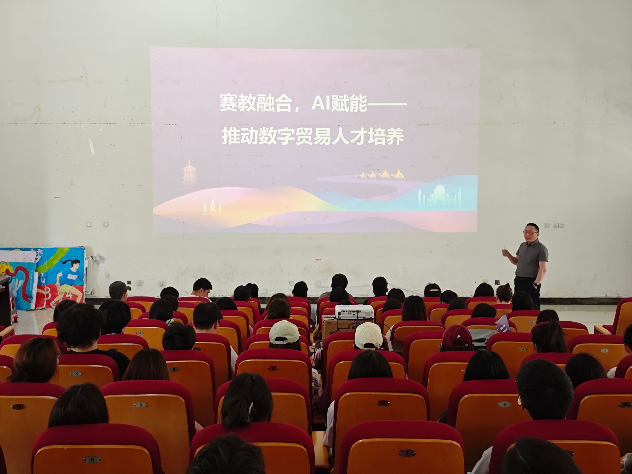 讲座中,易建安聚焦“数字贸易人才培养”这一核心议题,通过图文并茂的PPT展示,深入阐述了“赛教融合”(教育与实践竞赛相结合)的重要意义,以及人工智能技术在驱动数字贸易发展方面的广阔前景。他结合跨境电商运营、大数据分析等具体实践案例,分享了宝贵的行业经验,并激励学生积极投身学科竞赛,以此为未来的职业生涯拓宽发展路径。易建安还现场与同学们进行了热烈互动,就职业规划、专业技能提升等关切问题给予了耐心解答。