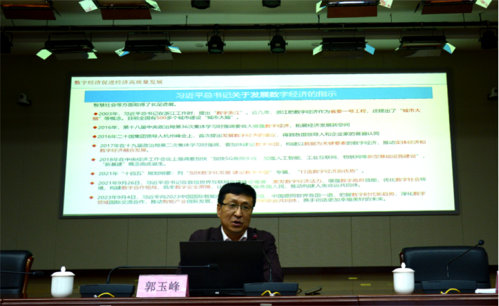 2023年9月27日, 新疆维吾尔自治区工信厅信息化推进处郭玉峰处长在温泉校区行政楼220会议室作题为“数字经济助力新疆经济高质量发展”的讲座,本次讲座由JRS体育 李全胜院长主持,JRS 全体教师及研究生参加。本次讲座由JRS体育 主办,自治区文科基地“丝绸之路经济带核心区产业高质量发展研究中心”承办。